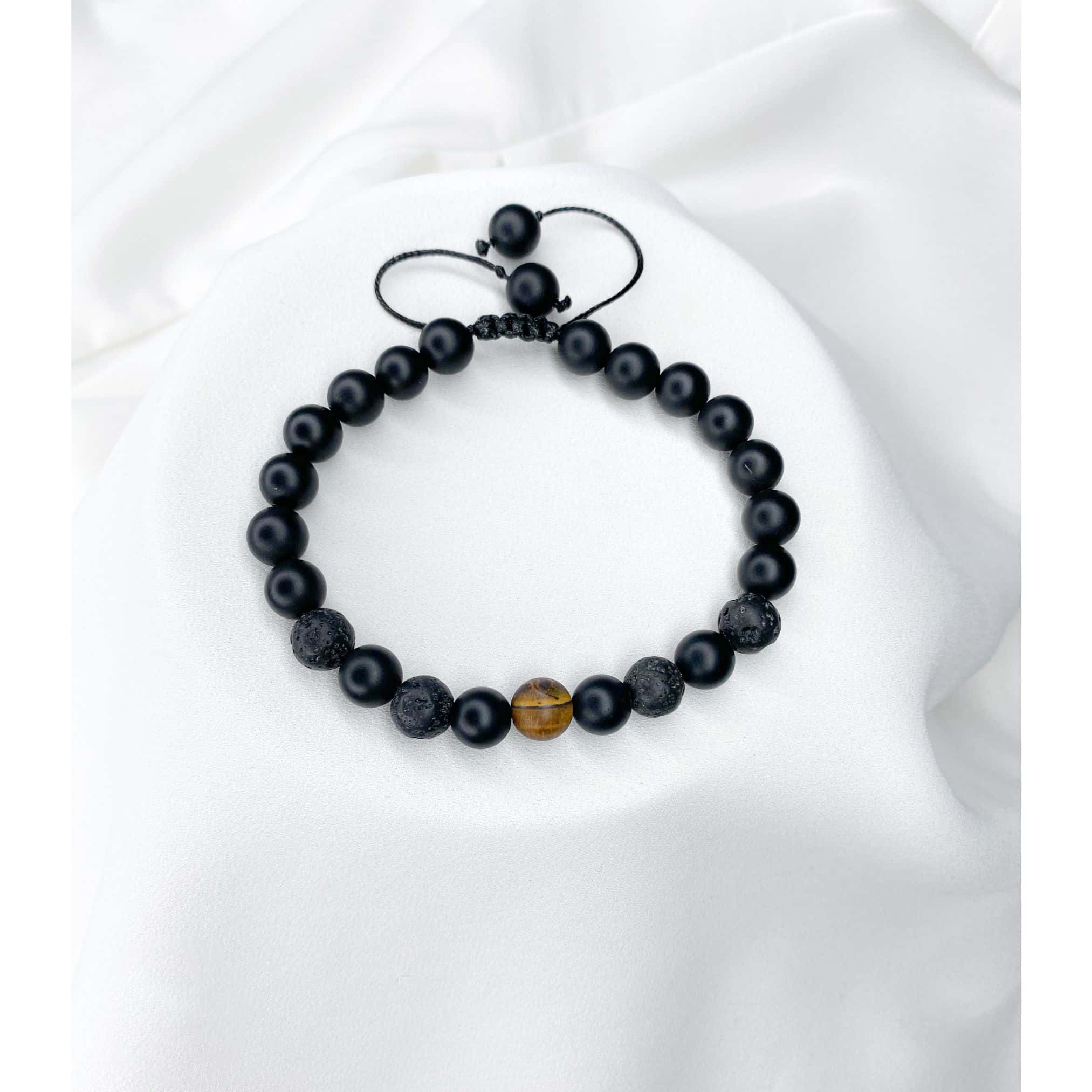 Bransoletka powstała z kamieni tygrysiego oka, onyksu i lawy wulkanicznej.