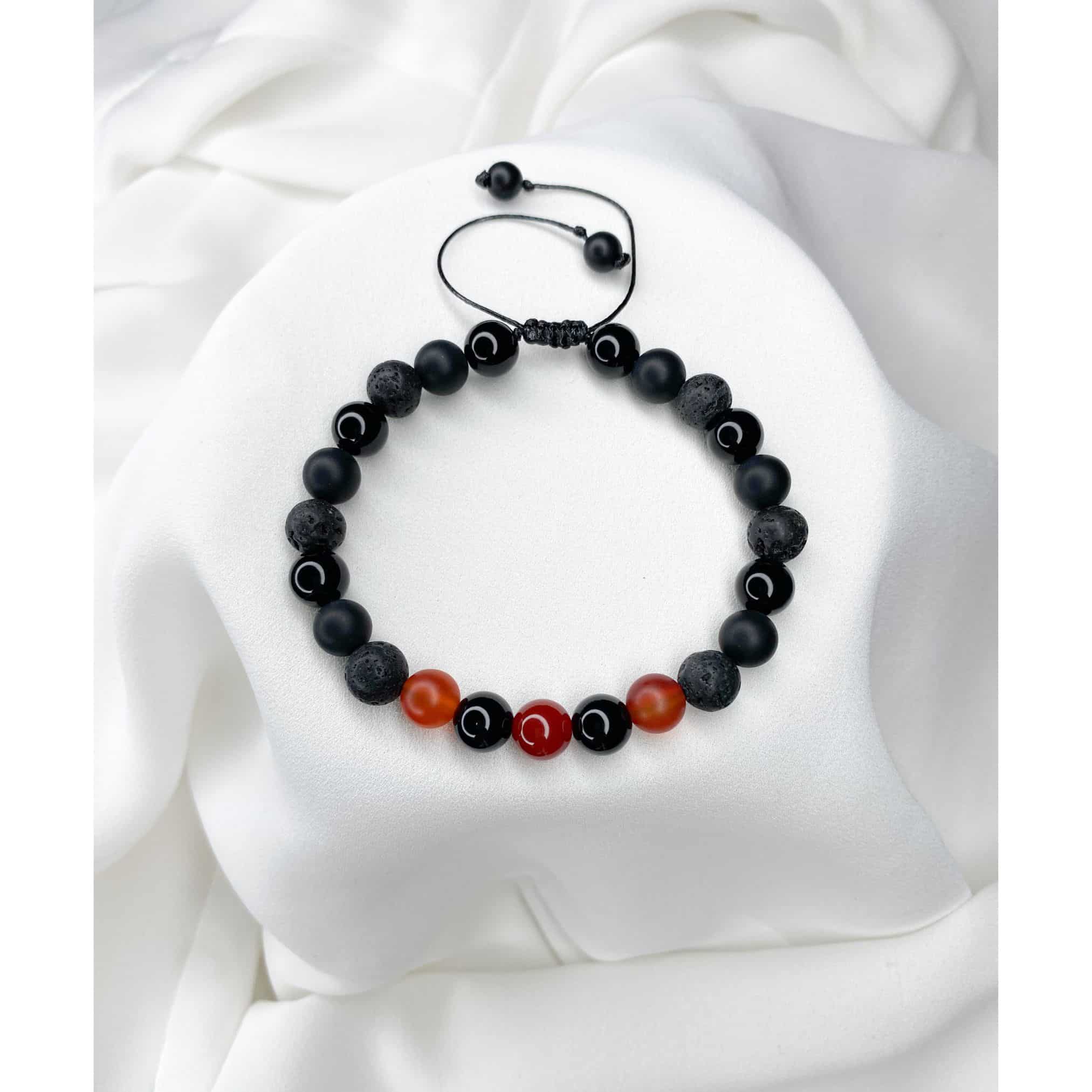 Ręcznie wykonana bransoletka z naturalnych kamieni karneolu, czarnego agatu oraz lawy wulkanicznej.