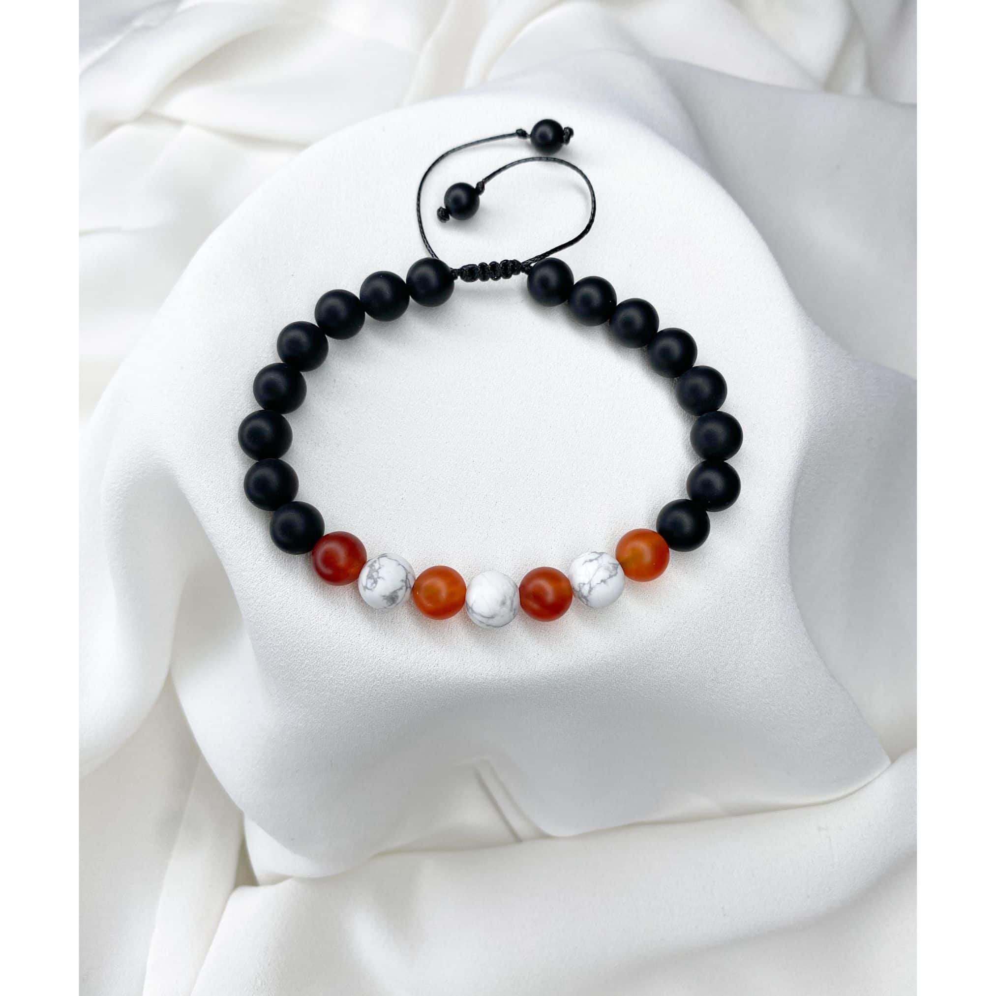 Ręcznie wykonana bransoletka z naturalnych kamieni howlitu, karneolu oraz czarnego agatu.