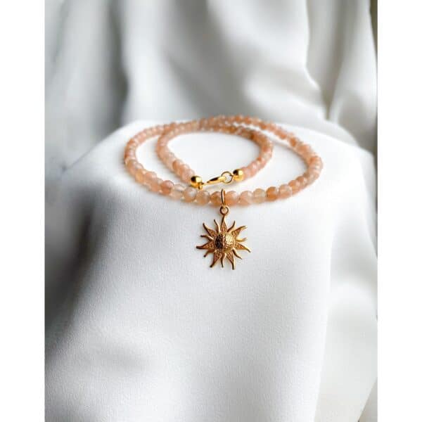 Kamień słoneczny zmniejsza wahania nastroju i pomaga odnaleźć życiową równowagę. Harmonizuje myśli i usuwa blokady wywołane przez smutek i troski. Wzmacnia kobiecą energię. Pomaga rozpalić wewnętrzne światło miłości oraz iść przez życie z pozytywnym nastawieniem. Wzmacnia energię życiową i nadaje kobiecej delikatności.