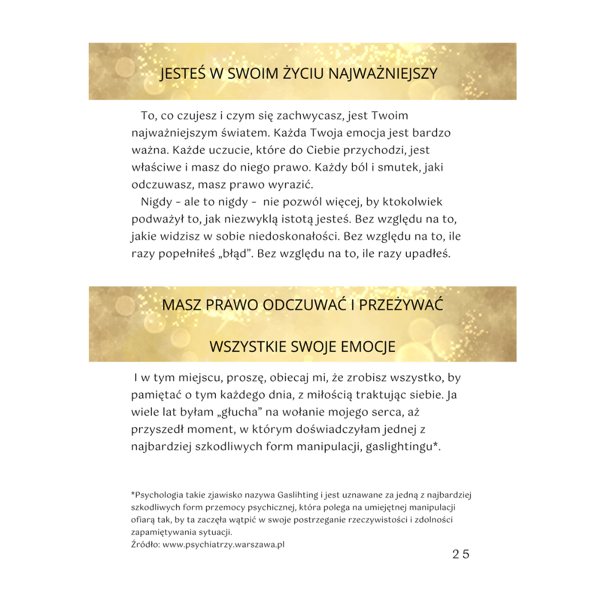 Dzisiaj wiem, że doświadczyłam tego, żeby wspierać takie osoby jak Ty, które tęsknią za największą miłością świata. Tej miłości nie ma na zewnątrz. Ona jest w Tobie. Wiem, że znajdziesz tam wiele wskazówek oraz ważnych słów, które mogą odmienić Twoje życie.