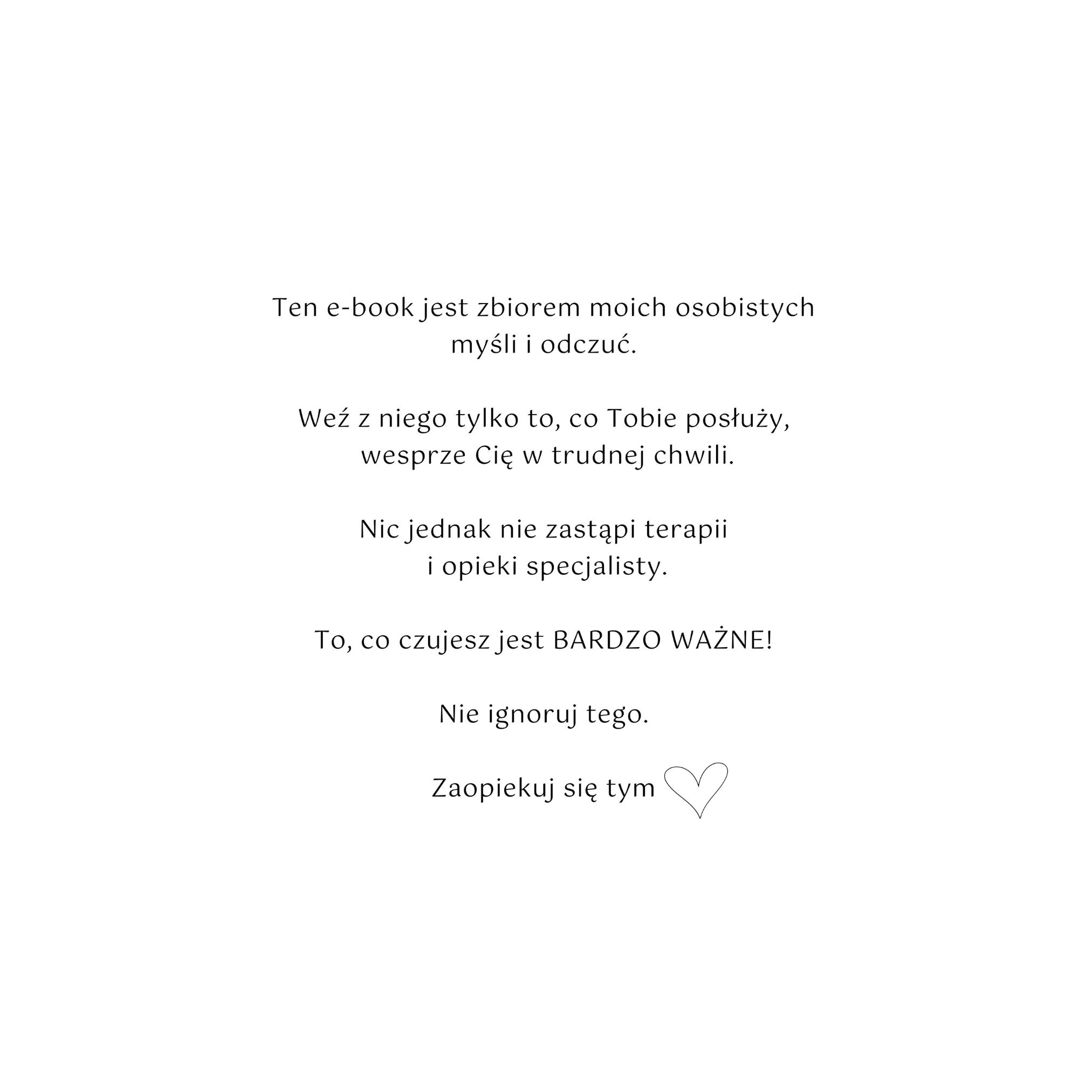 Ten e-book powstał w momencie totalnej niemocy. W chwili, kiedy nawet pójście do toalety było ogromnym wyzwaniem. Wszechświat chyba tak sprawił, żebym zaniemogła, aby napisać tych kilka słów wsparcia. Może jest tam coś co potrzebujesz przeczytać. Wiedz, że nie jesteś sama/sam w tym trudnym momencie. Jeśli jest w Twoim otoczeniu ktoś, kto przechodzi trudny moment, to prześlij mu tu tego e-booka. Wspierajmy się i pomagajmy sobie.