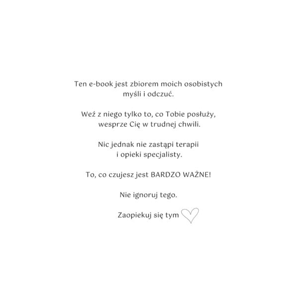 Ten e-book to moja osobista podróż w poszukiwaniu prawdy o miłości. Żeby ją poznać, musiałam eksplorować najciemniejsze zakamarki niemiłosnego świata. Przeszłam go wzdłuż i wszerz. Dzisiaj wiem, że jest to świat pusty i pełen cierpienia. Mimo to, sama i o własnych siłach podniosłam się z kolan i obiecałam sobie, że już nigdy więcej się od siebie nie odwrócę.